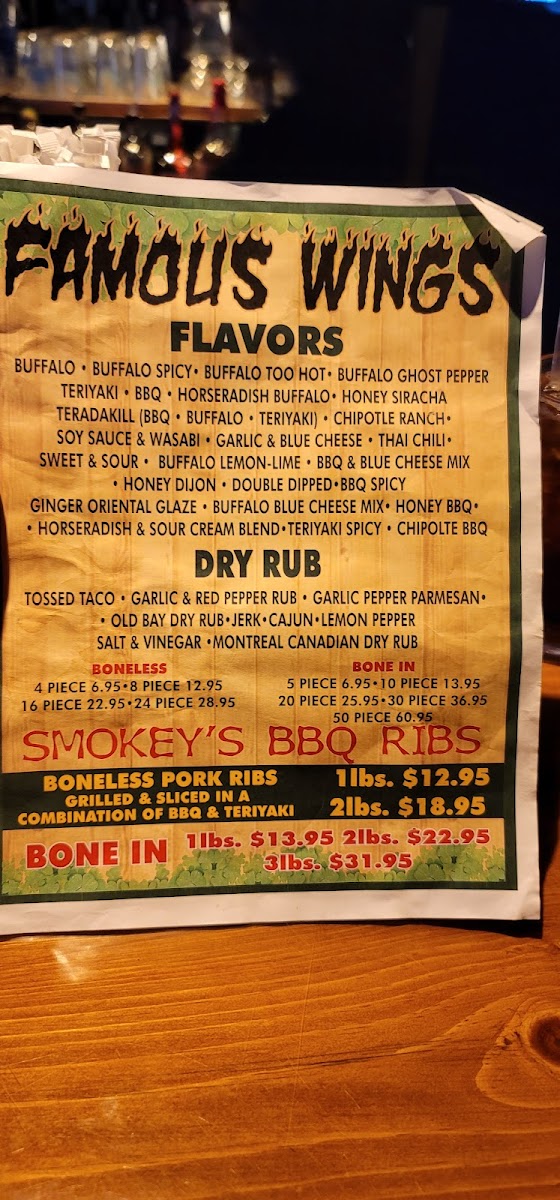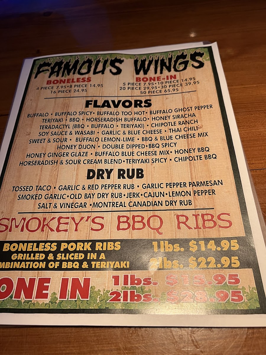 Smokey O'Grady's offers a straightforward, relaxed menu centered around hearty barbecue classics and casual bar fare. Whether you're stopping by for a quick bite or settling in with friends over drinks, the selection features comforting dishes like slow-cooked ribs, boneless chicken dinners in flavorful sauces, and their notably popular bone-in wings.