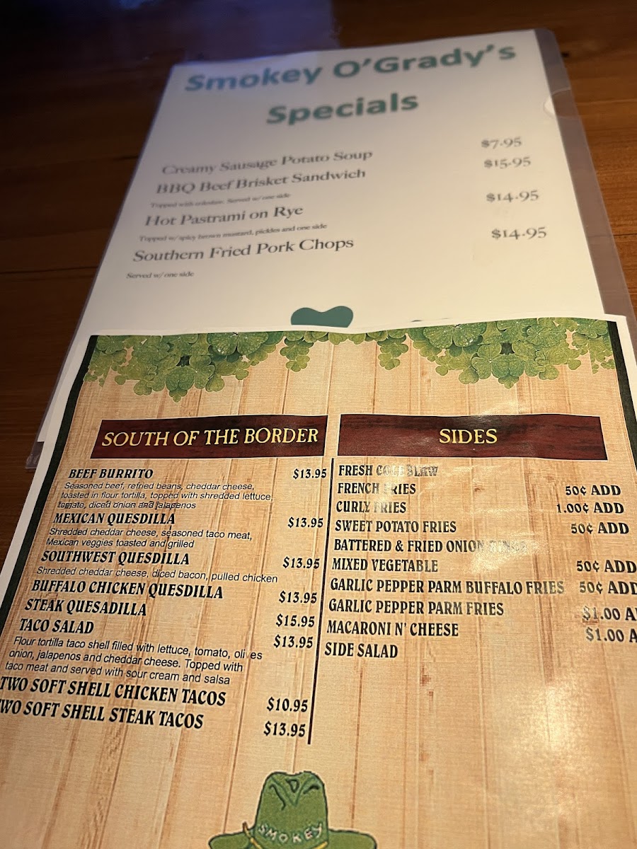 Overall, Smokey O'Grady's menu supports a welcoming environment where the focus is on straightforward, satisfying food and drinks that complement good company and easy conversation.