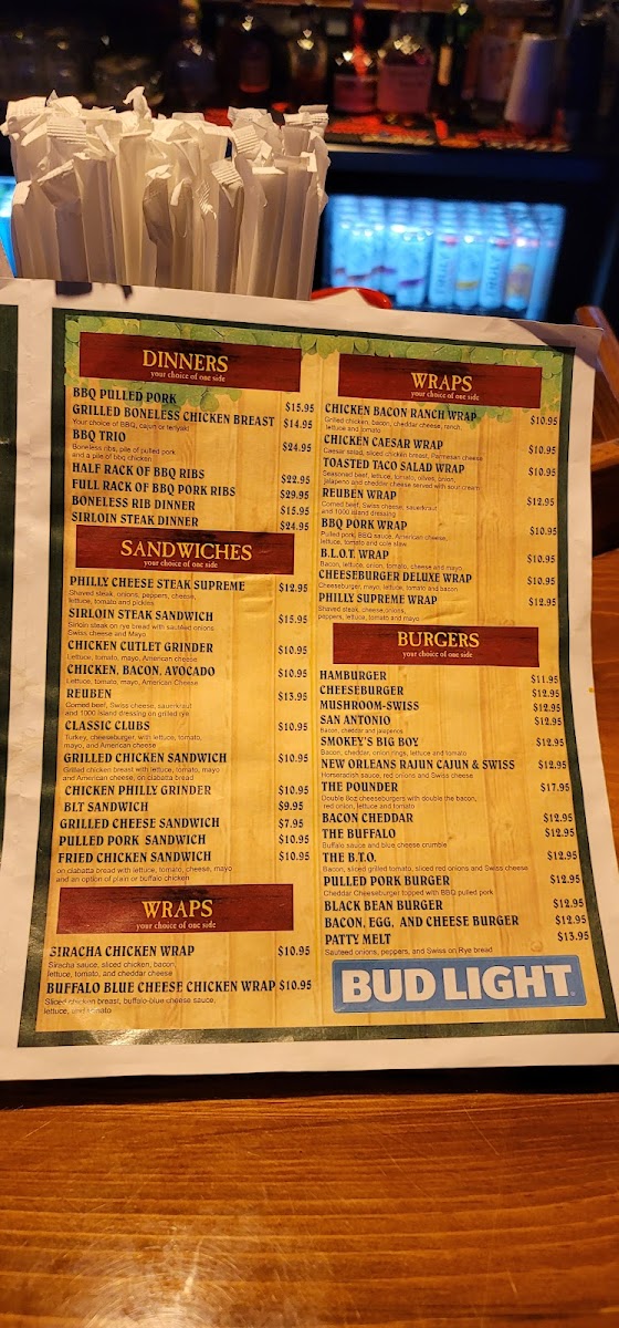 The menu pairs well with the casual, lively atmosphere typical of neighborhood bars. Many guests enjoy pairing their meals with an ice-cold draft, such as Bud Light or Yuengling, making it a natural spot for unwinding after work or gathering for weekend evenings. The Harvest Salad with Cajun Chicken also offers a lighter option amid the rich, smoky flavors.